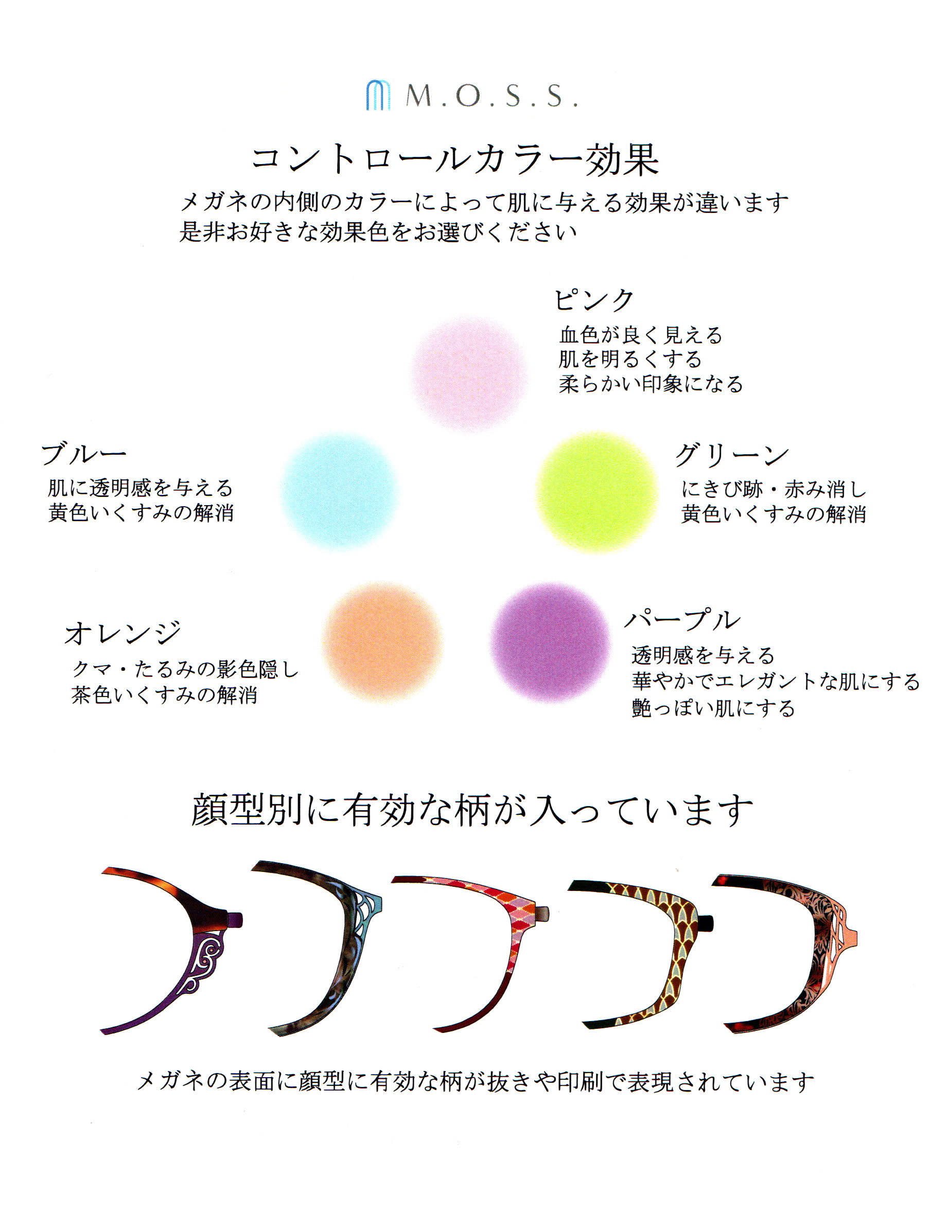 顔型別に綺麗に魅せれるよう計算されたレンズシェイプ、装飾を用いています。2色のカラーを採用し、フロントの表側は顔を引き締めるカラー、裏側には化粧品の下地でも使われるコントロールカラーを使い、顔を明るく見せます。自分に最適な形、柄、装飾、効果カラーを選ぶ楽しみのある眼鏡です。