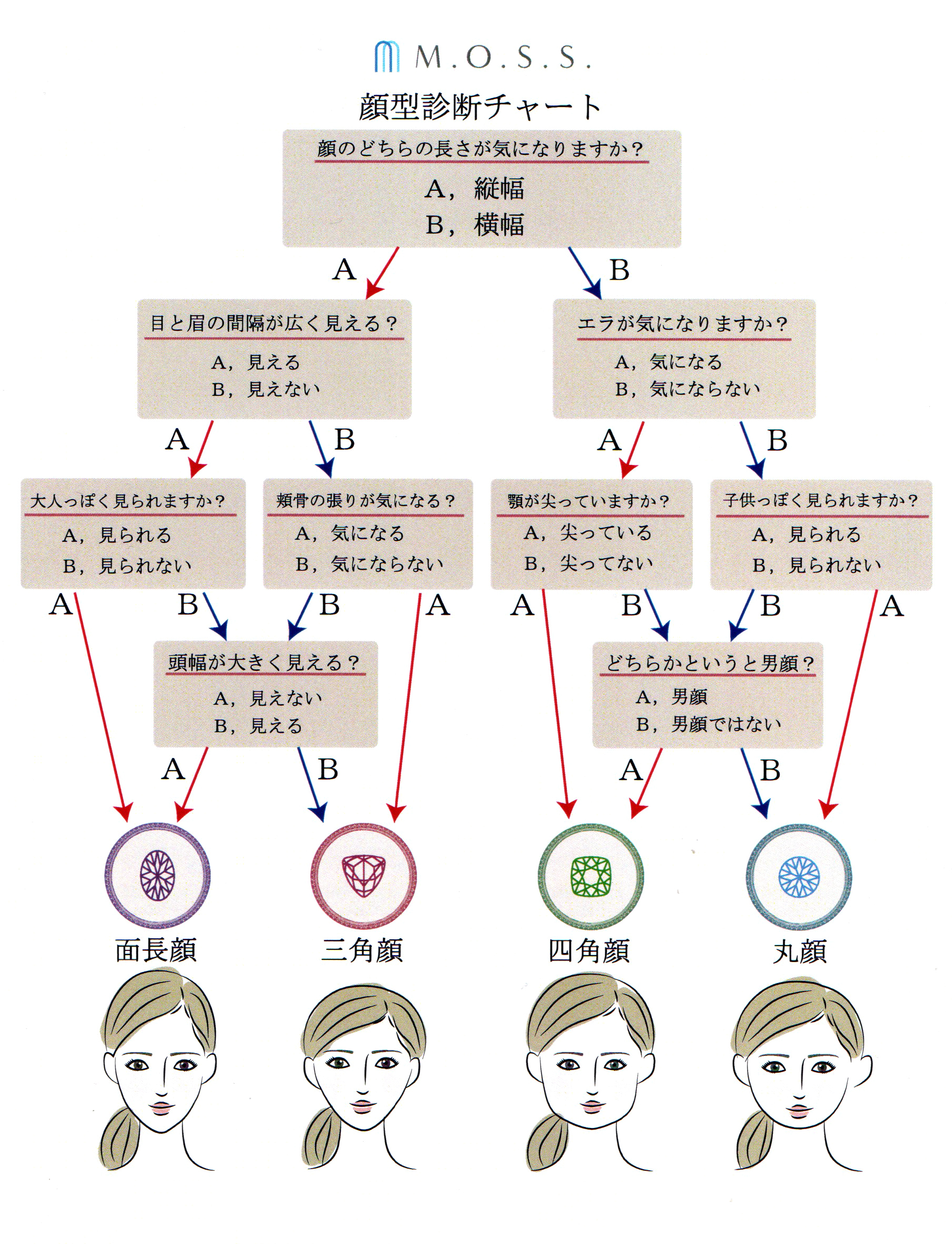 「M.O.S.S(モス)」は顔型を丸顔、面長顔、三角顔、四角顔の4パターンに分類し、各々の顔型に合うようにデザインされています。