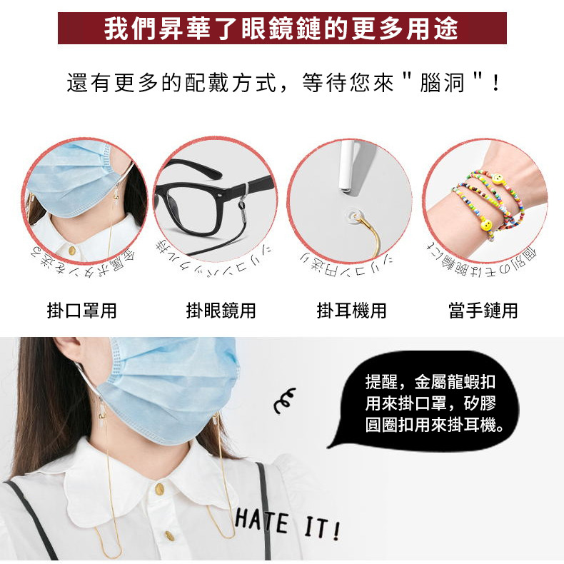 鏈頭更換後可以作為眼鏡鏈、口罩鏈、項鍊飾品等多種用途。